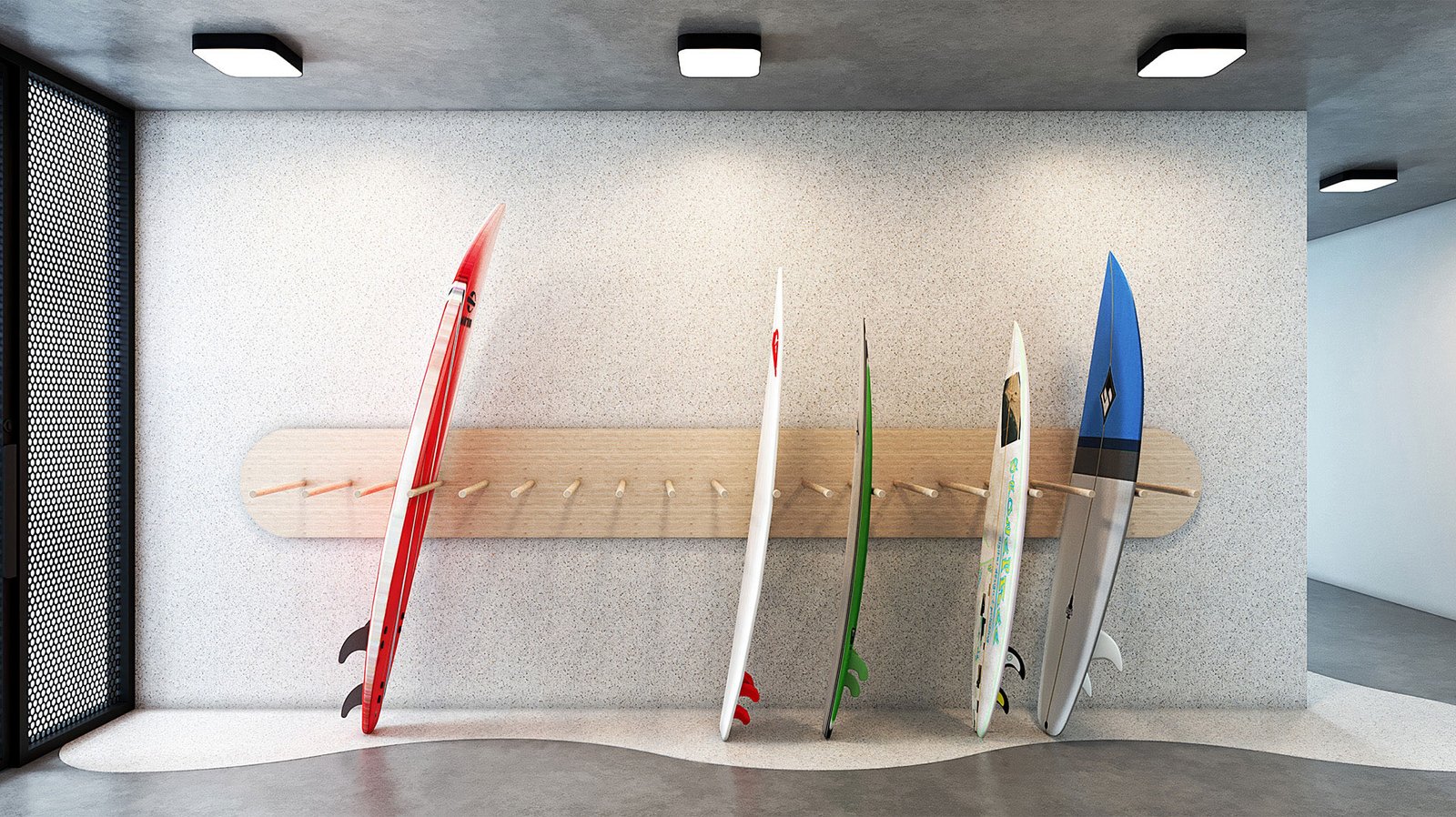 Área dedicada ao armazenamento de pranchas de surf e stand up.