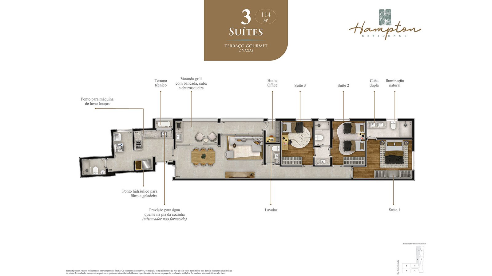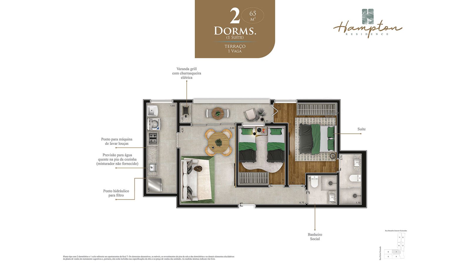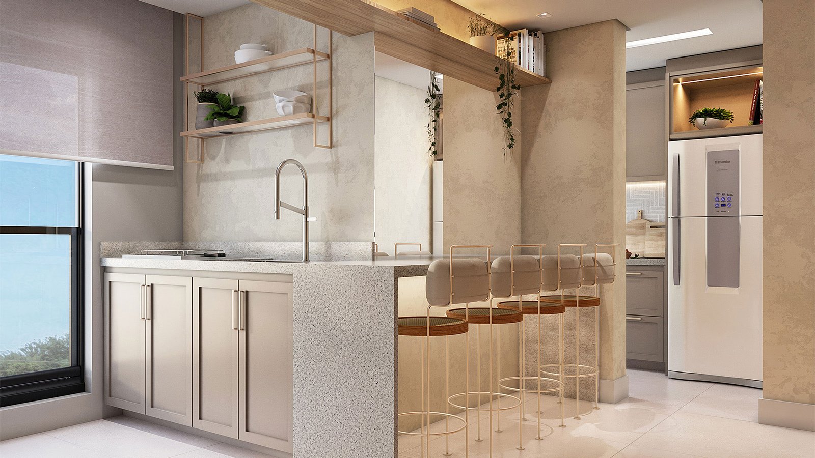 As varandas do HAMPTON RESIDENCE serão entregues com bancada, cuba e ponto elétrico.