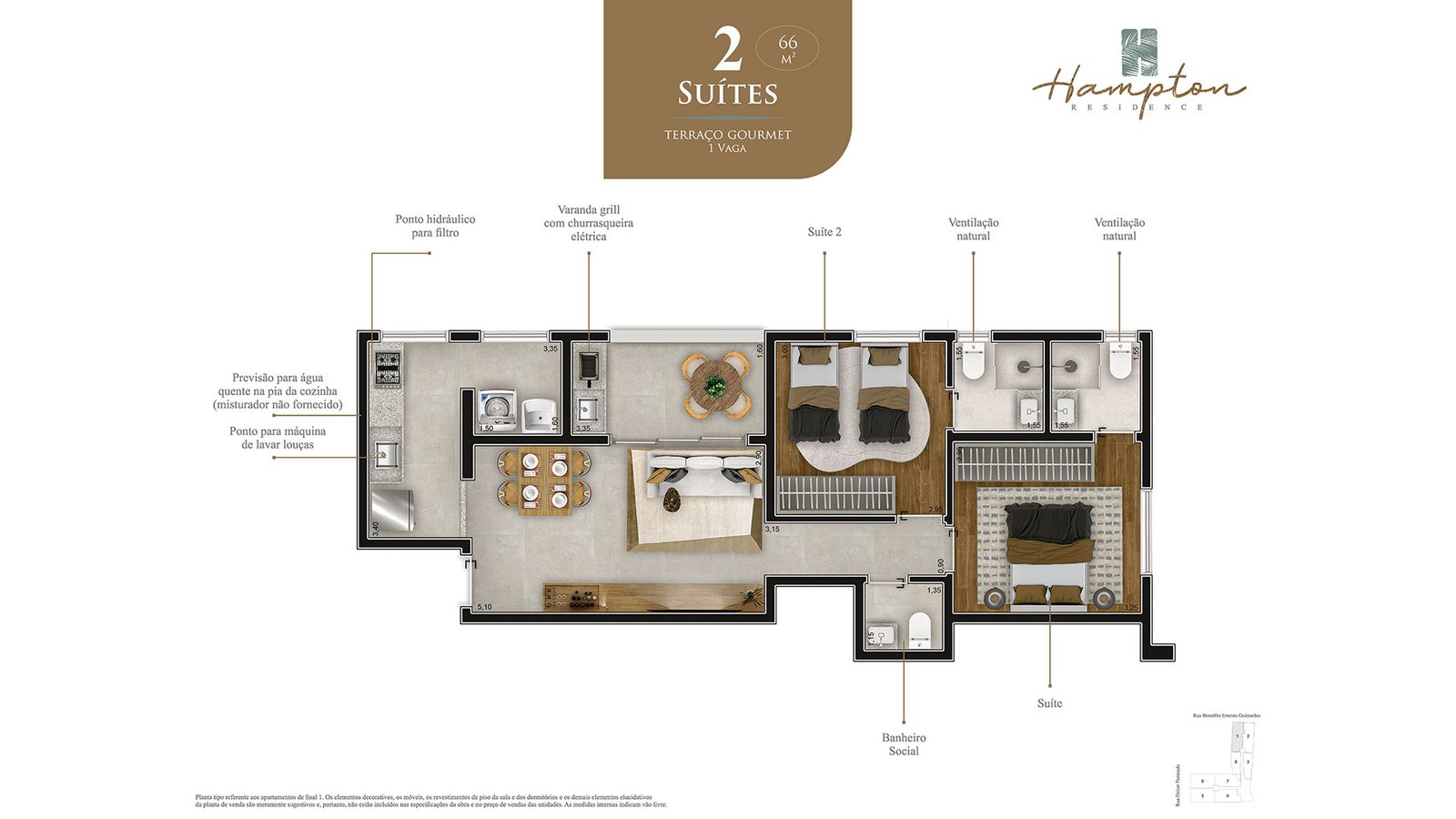 O empreendimento será entregue com as áreas comuns equipadas e decoradas conforme memorial descritivo.